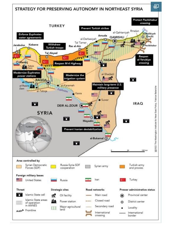 Auf der folgenden Karte sind die militärischen Akteure der Region wie auch militärische und infrastrukturelle Maßnahmen, welche zur Absicherung der AANES nötig wären, eingezeichnet: