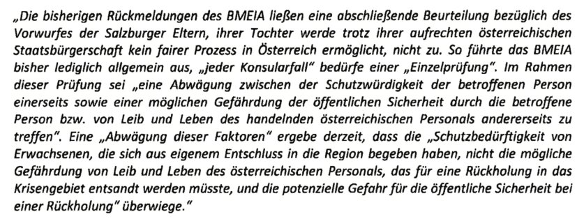 Das Argument, die Interessen des für die Rückholung erforderlichen Personals gingen der Schutzwürdigkeit der Erstbeschwerdeführerin vor, sei nicht nachvollziehbar, da die Rückholung einzelner Staatsbürger – wenngleich minderjährig – in der Vergangenheit erfolgreich durchgeführt wurde. Die Erstbeschwerdeführerin sei nicht in der Lage, den Schutz ihrer Kinder aus eigener Kraft zu gewährleisten. Zudem könnten weder Syrien noch die kurdischen Behörden mangels Fähigkeit und Bereitschaft den Schutz für die Beschwerdeführer gewährleisten.