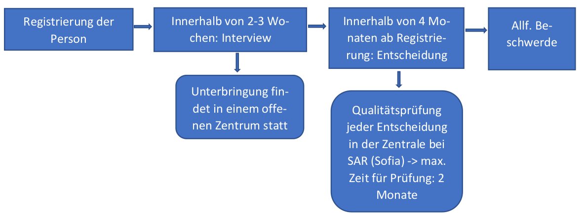 Zuständig für das erstinstanzliche Asylverfahren (Registrierung und Bearbeitung der Anträge, Unterbringung der Asylwerber, Dublin-Verfahren und COI) ist die Staatliche Agentur für Flüchtlinge beim Ministerrat (State Agency for Refugees with the Council of Ministers, SAREF) (SAREF 2023).