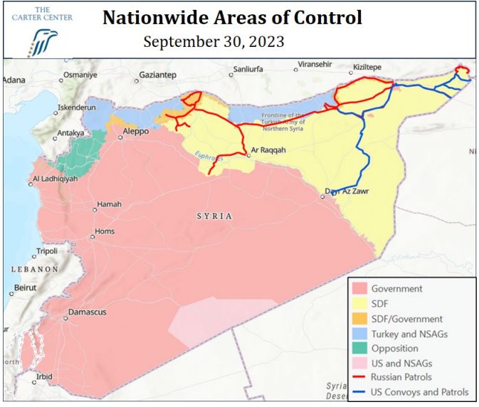 Die folgende Karte zeigt Kontroll- und Einflussgebiete unterschiedlicher Akteure in Syrien, wobei auch Konvoi- und Patrouille-Routen eingezeichnet sind, die von syrischen, russischen und amerikanischen Kräften befahren werden. Im Nordosten kommt es dabei zu gemeinsam genutzten Straßen [Anm.: zu den Gebieten mit IS-Präsenz siehe Unterkapitel zu den Regionen]: