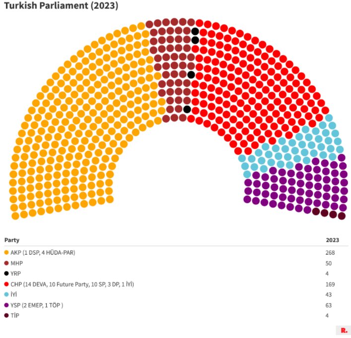 In der neu gewählten Nationalversammlung sitzen zusätzlich Vertreter und Vertreterinnen mehrer Kleinparteien, welche auf den Listen der AKP, der CHP und er YSP standen. So entfallen von den 268 Sitzen der AKP vier auf die kurdisch-islamistische Partei der Freien Sache, Hür Dava Partisi - HÜDA-PAR und ein Sitz auf die Demokratische Linkspartei, Demokratik Sol Parti - DSP. Von den 149 Mandaten der CHP gehören 14 der Partei für Demokratie und Fortschritt, Demokrasi ve Atılım Partisi - DEVA [des ehemaligen Wirtschaftsministers Ali Babacan], zehn der Zukunftspartei, Gelecek Partisi - GP [des ehemaligen Ministerpräsidenten Ahmet Davutoğlu] und weitere zehn der islamisch-konservativen Partei der Glückseligkeit, Saadet Partisi -SP und drei der Demokratischen Partie, Demokrat Parti - DP. Über die CHP-Liste bekam die ansonsten eigenständig kandidierende İYİ-Partei zu ihren 43 Sitzen noch einen Sitz dazu. Über die Listen der Links-Grünen Partei erhielten die Partei der Arbeit, Emek Partisi - EMEP zwei sowie die Partei der Sozialen Freiheit, Toplumsal Özgürlük Partisi - TÖP eines der YSP-Mandate [Anm.: die Zahl der YSP von 63 in der Grafik entspricht nicht jener des amtlichen Wahlresultats von 61 Mandataren] (Duvar 18.5.2023, vgl. BIRN 19.5.2023), was mit den übrigen 58 YSP die offiziellen 61 Parlamentarier ergibt (BIRN 19.5.2023).