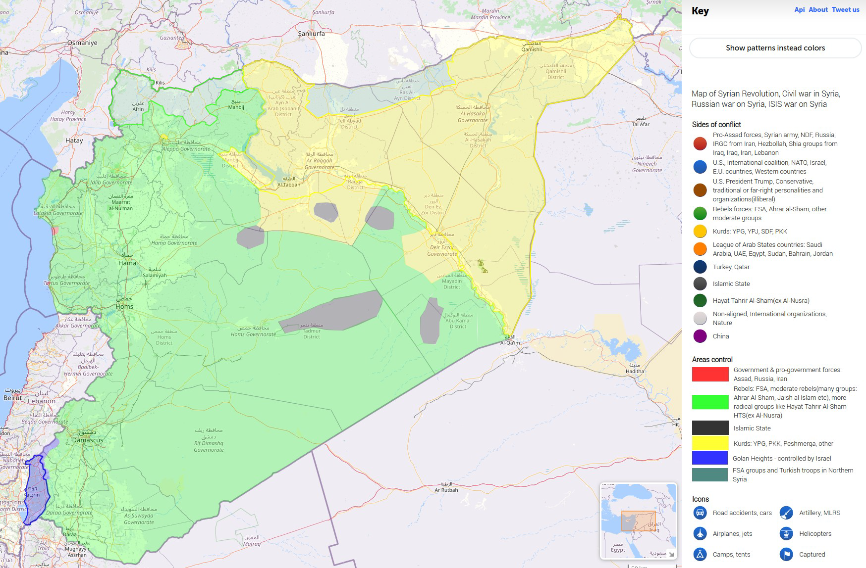 Der Think Tank Newslines Institute for Strategy and Policy sieht auf der folgenden Karte besonders die Gebiete von Tal Rifa'at, Manbij und Kobanê als potenzielle Ziele einer türkischen Offensive. Auf der Karte sind auch die Strecken und Gebiete mit einer Präsenz von Regime- und pro-Regime-Kräften im Selbstverwaltungsgebiet ersichtlich, die sich vor allem entlang der Frontlinien zu den pro-türkischen Rebellengebieten und entlang der türkisch-syrischen Grenze entlangziehen.