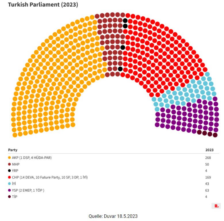 Bei den gleichzeitig mit der ersten Runde der Präsidentschaftswahl stattgefundenen Parlamentswahlen erhielt die "Volksalliance" unter Führung der AKP mit 49 % der Stimmen eine absolute Mehrheit der 600 Parlamentsitze. - Die AKP gewann hierbei 268 (35,6 %), die ultranationalistische MHP 50 (10,1 %) und die islamistische Neue Wohlfahrtspartei - Yeniden Refah Partisi (YRP) fünf Sitze (2,8 %). Das Oppositionsbündnis "Allianz der Nation" unter der Führung der säkularen, sozialdemokratisch ausgerichteten CHP erlangte 35 %, wobei die CHP 169 (25,3 %) und die nationalistische İYİ-Partei 43 Sitze (9,7 %) errang. Aus dem Bündnis mehrerer Linksparteien unter dem Namen "Arbeit und Freiheitsallianz" schafften die Links-Grüne Partei - Yeşil Sol Parti (YSP) mit künftig 61 (8,8 %) und die "Arbeiterpartei der Türkei" -Türkiye İşçi Partisi (TİP) mit vier Abgeordneten den Sprung ins Parlament (TRT 2023; vgl. BBC 22.5.2023). Das Ergebnis wurde am 30.5.2023 mit dem Entscheid des Obersten Wahlrates amtlich (YSK 30.5.2023).