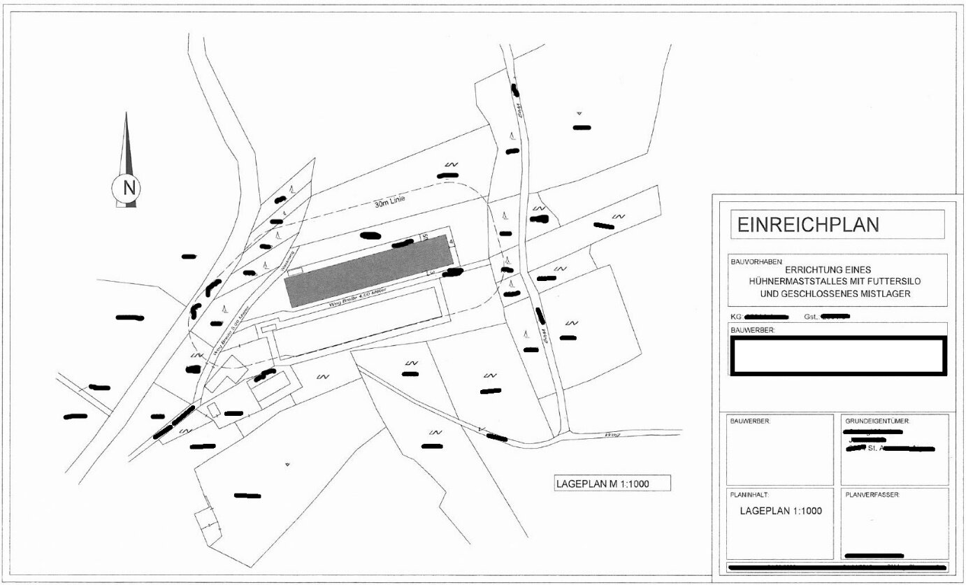 Die G H GmbH ist im Firmenbuch unter FN***** mit der Geschäftsanschrift J, St. A a A und dem Geschäftszweig landwirtschaftlicher Betrieb eingetragen. Handelsrechtlicher Geschäftsführer ist I J, geboren am *****. Die G H GmbH betreibt auf Grundstück ****, KG J, ca. 12 Meter südlich des Vorhabens A B und getrennt durch einen ca. vier Meter breiten Weg, einen Stall für 39.600 Mastgeflügelplätze. Die Zufahrt zum Masthühnerstall erfolgt von der im Westen vorbeiführenden Landesstraße aus über öffentliches Gut (Grundstück Nr. ****) und sodann südlich von der von I J senior benutzten „Krenlagerhalle“. Die Manipulationsflächen für das Ein- und Ausstallen befinden sich zwischen der Krenlagerhalle und dem Masthühnerstall.