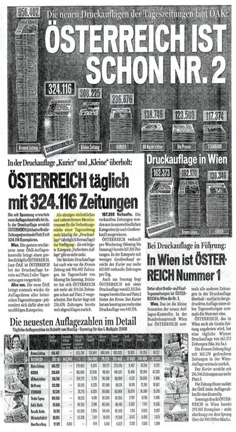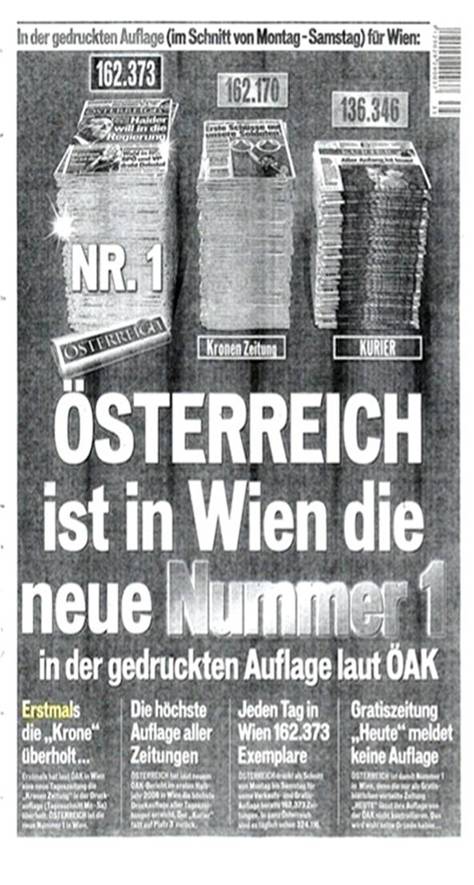 Gestützt auf die Zahlen der ÖAK erschienen im August 2008 sowie im Jänner und Februar 2009 in der Zeitung der Erstbeklagten die im Anhang zu dieser Entscheidung abgedruckten Werbemitteilungen; die Zweitbeklagte hielt diese Inhalte auf ihrer Website zum Abruf bereit. Darin wurden die Druckauflagen (unter anderem) der Zeitungen der Klägerin und der Erstbeklagten miteinander verglichen. Aufgrund eines Vorsprungs von etwa 200 Stück behaupteten die Beklagten, die Zeitung der Erstbeklagten sei in Wien die „Nummer 1“. Österreichweit sei diese Zeitung die „Nummer 2“. Beide Aussagen waren blickfangartig hervorgehoben und mit einem Hinweis auf die Druckauflagen verbunden.