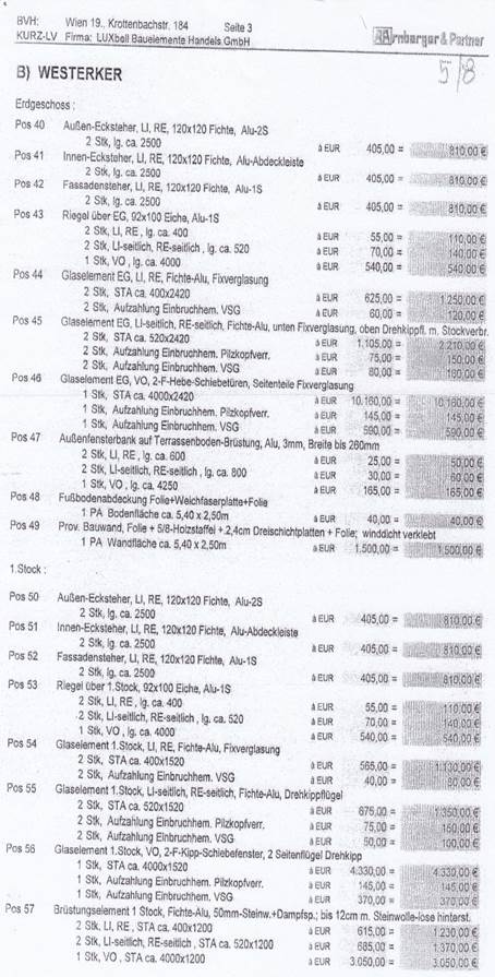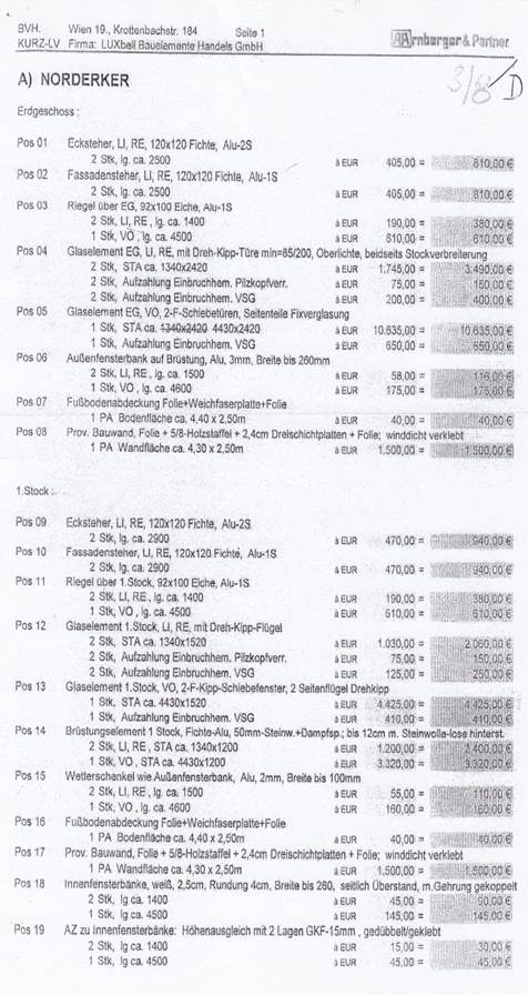 a) Erdgeschoss entsprechend dem einen integrierenden Bestandteil dieses Spruches bildenden Anbot der Fa. L***** GmbH (Beilage ./D) die Pos 01, 02, 03, 06, 07, 08;