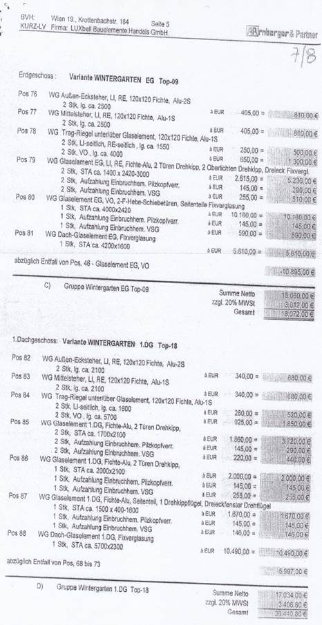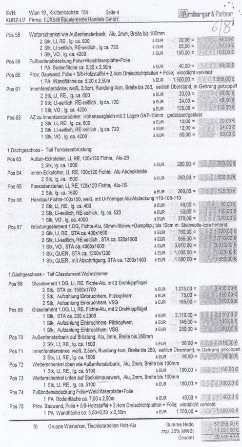c) 1. Dachgeschoss ‑ Teil Terrassenbrüstung entsprechend dem einen integrierenden Bestandteil dieses Spruches bildenden Anbot der L***** GmbH (Beilage ./D) die Pos 63, 64, 65, 67;