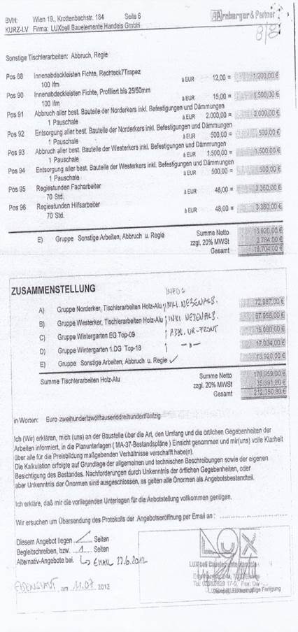 c) 1. Dachgeschoss entsprechend dem einen integrierenden Bestandteil dieses Spruches bildenden Anbot der L***** GmbH (Beilage ./D) die Pos 20, 21, 22, 25, 27, 28;