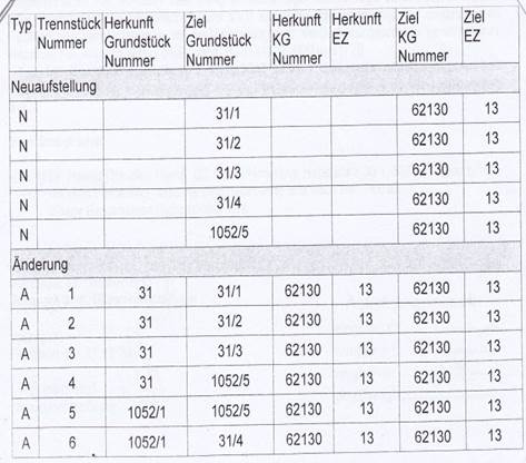 „In EZ 13, 370 und 371 KG ***** werden aufgrund des Kaufvertrags vom 17. 4. 2013, des Bescheids der Bezirkshauptmannschaft S***** vom 16. 5. 2013, GZ BHSO-8.4-581-2013, des Rangordnungs‑beschlusses vom 14. 3. 2013, TZ 1511/2013, des Kaufvertrags vom 29. 7. 2013, des Bescheids der Bezirkshauptmannschaft S***** vom 28. 8. 2013, GZ BHSO-8.4.1101-2013, des Bescheids der Gemeinde K***** vom 26. 3. 2013, Zl 031-4/13/3613/1/12, der Trennstücktabelle vom 18. 10. 2013, GZ 597/2013/62, der Vermessungsurkunde vom 8. 3. 2013, GZ 3613/1/12, des Bescheids des Vermessungsamts vom 19. 4. 2013, GZ 597/2013/62, und der einlagenbezogenen Trennstücktabelle vom 31. 10. 2013 nachstehende Eintragungen bewilligt: