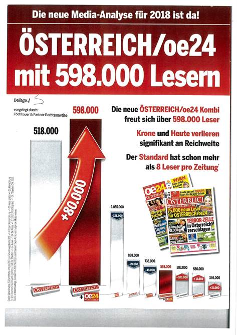 3.2. Wahr ist bloß, dass zum selben Erhebungszeitpunkt (MA 2018) die Reichweite von „Österreich“ 518.000 Leser betrug, jene von „Österreich/oe24-Kombi“ 598.000. Darin liegt aber keine Steigerung von einem Erhebungszeitpunkt bis zum nächsten, wie in der gebotenen Gesamtbetrachtung der Werbeeinschaltung aufgrund der zu den Konkurrenzmedien angegebenen Reichweitenentwicklung zu vermuten wäre. Nimmt man die Entwicklung von „Österreich“ laut MA 2017 zu „Österreich/oe24-Kombi“ laut MA 2018 als Maßstab heran (wie das bei den daneben abgebildeten Konkurrenzmedien der Fall war), beträgt die Steigerung zum Ergebnis der MA 2018 ebenfalls keine 80.000, sondern bloß 75.000 Leser. Die Veröffentlichung der Beklagten in Bezug auf die Erhöhung ihrer Leserzahl ist daher auch unter diesem Gesichtspunkt irreführend.