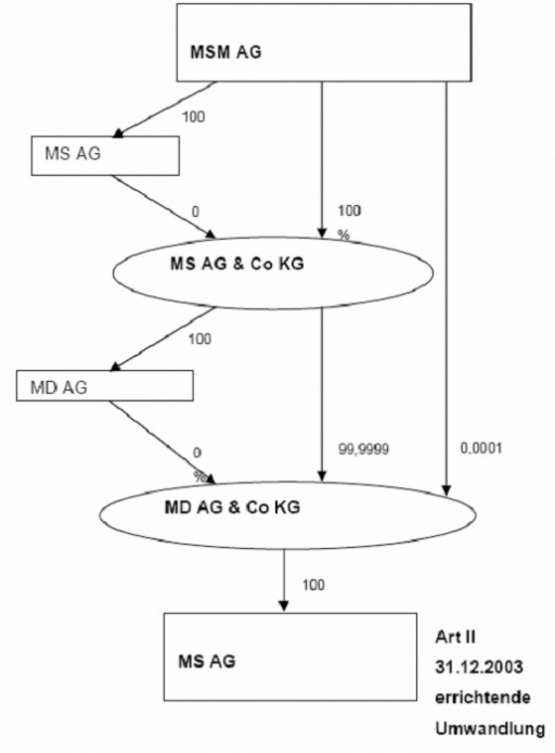 Mit Kaufverträgen vom 16.09.2004 erwarb die MD AG & Co KG sämtliche Anteile der MS AG. Danach erfolgte eine errichtende Umwandlung der MS AG in die MS GmbH & Co OHG. An der MD AG & Co KG bestanden am Tag des Umwandlungsbeschlusses folgende Beteiligungsverhältnisse: MD AG mit 0% als Komplementär und als Kommanditisten die MS AG & Co KG mit 99,9999% und die MSM AG mit 0,0001%. 100-prozentiger Kommanditist der MS AG & Co KG ist die MSM AG (siehe das nachstehende Organigramm).