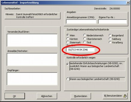 Hinweis: Bis zu einer entsprechenden Änderung der Vorlage "Lebensmittel-Importmeldung [Set 144]" im Zoll Standardset ist unter "Zuständige Lebensmittelaufsichtsbehörde" wie bisher das Bundesland auszuwählen, in dem die Einfuhrkontrolle durchgeführt werden soll, die Fax-Nr. ist aber immer auf 01/713 44 04 2346 zu ändern!