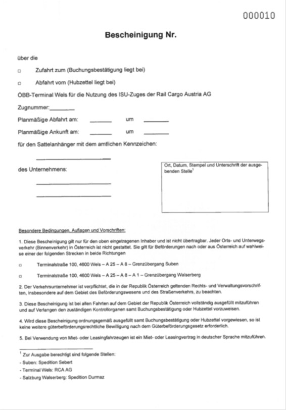 Da die UKV-Zugverbindung von Triest nach Wels ("ISU-Zug') von der Rail Cargo Austria AG (RCA AG) betrieben wird, können die Bescheinigungen (Muster 1) durch die RCA AG mit folgenden Bedingungen und Auflagen ausgegeben werden: