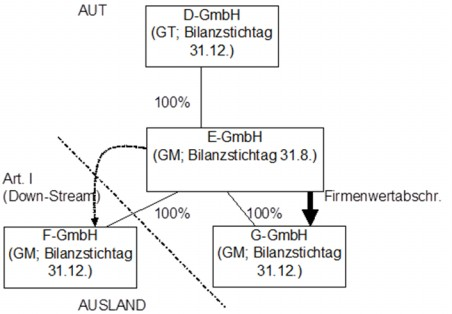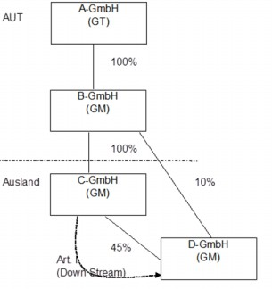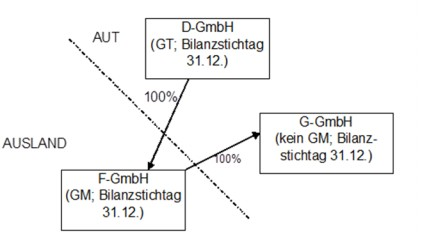In diesem Fall kann eine inländische Tochtergesellschaft D eines ausländischen Gruppenmitglieds trotz ausreichender finanzieller Verbindung nicht in die Unternehmensgruppe einbezogen werden. (Bewertung der Beteiligung an der C und D gemäß § 16 Abs. 1 UmgrStG ; siehe Rz 857).