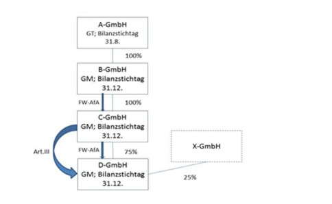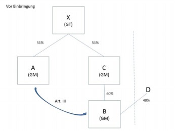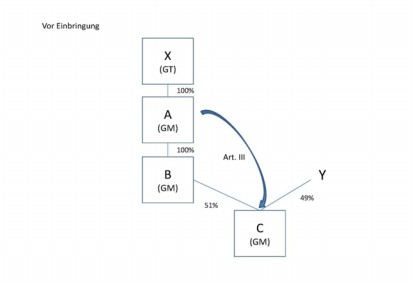Die Unternehmensgruppe besteht aus der A-GmbH als Gruppenträger, der 100-prozentigen Tochter B-GmbH und der 100-prozentigen Tochter C-GmbH. Alle Gesellschaften bilanzieren auf den 31.12. Die unbeschränkt steuerpflichtige Y-GmbH bringt ihren Betrieb zum 31.12.02 in die B-GmbH gegen Gewährung neuer Anteile ein, sodass die Y-GmbH nach der Einbringung an der B-GmbH im Ausmaß von