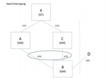 Bleibt die finanzielle Verbindung nach der Einbringung erhalten, weil die A-GmbH eine mehr als 50-prozentige Beteiligung hält, ändert sich nichts an der Unternehmensgruppe. Die einbringungsbedingte Verminderung der Beteiligungsquote an der B-GmbH bewirkt keine Änderung der Firmenwertabschreibung, da sich die Bemessungsgrundlage nicht ändert.
