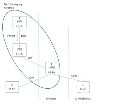 Die inländische X-GmbH ist auf dem Gebiet der Forschung tätig. Zum 31.12.08 wird die X-GmbH auf die Y-Ges. verschmolzen, die in einem EU-Mitgliedstaat ansässig ist, dessen Steuerrecht die Aktivierung der Forschungsaufwendungen vorsieht (das durch die Forschungstätigkeit geschaffene immaterielle Wirtschaftsgut verbleibt nicht im Inland).