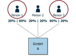 Person 1 ist - obwohl sie an GmbH A nur mit 20% beteiligt ist - direkter wirtschaftlicher Eigentümer der GmbH A, da sie über 60% der Stimmrechte verfügt. Person 2 ist kein direkter wirtschaftlicher Eigentümer der GmbH A, da sie mit 20% keine ausreichende Beteiligung hält, mit 20% über keinen ausreichenden Anteil an Stimmrechten verfügt und auch sonst keine Kontrolle ausübt. Person 3 ist direkter wirtschaftlicher Eigentümer der GmbH A, da sie mit einem Anteil von 60% ausreichend an der GmbH A beteiligt ist.