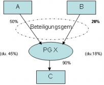 An der operativ tätigen Personengesellschaft X sind die GmbH A zu 50% und die GmbH B zu 20% beteiligt, die Personengesellschaft hält ihrerseits 90% der Anteile an der GmbH C. A und B sind an C jeweils mittelbar nicht ausreichend beteiligt (durchgerechnet zu 45% und 18%). Sie bilden daher eine Beteiligungsgemeinschaft und beziehen GmbH C in die Unternehmensgruppe ein.