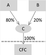 Die inländische A-GmbH ist unmittelbar zu 80% und die inländische B-GmbH ist unmittelbar zu 20% an der inländischen C-OG beteiligt. Die C-OG hält unmittelbar 100% der Anteile an einer niedrigbesteuerten ausländischen Körperschaft ("CFC").