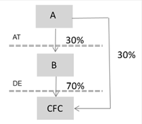 Die inländische A-GmbH hält 30% an der in Deutschland ansässigen B-GmbH, die wiederum 70% an der im Staat X ansässigen, niedrigbesteuerten X-GmbH ("CFC") hält. Gleichzeitig hält die A-GmbH selbst eine unmittelbare Beteiligung an der X-GmbH von 30%.
