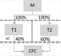 Die ausländische M-GmbH hält je 100% an der inländischen T1-GmbH und an der ausländischen T2-GmbH. Die T1-GmbH hält ihrerseits 40% an der niedrigbesteuerten CFC, an der auch die T2-GmbH ihrerseits zu 60% beteiligt ist.