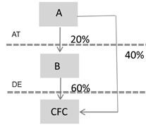 Die inländische A-GmbH hält 20% an der in Deutschland ansässigen B-GmbH, die wiederum 60% an der im Staat X ansässigen, niedrigbesteuerten X-GmbH ("CFC") hält. Gleichzeitig hält die A-GmbH selbst eine unmittelbare Beteiligung an der X-GmbH von 40%.