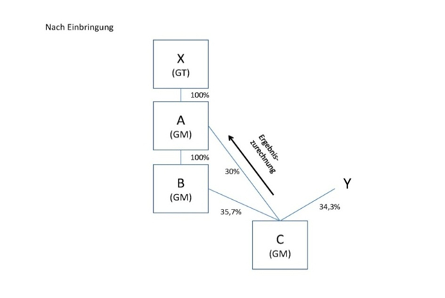 Am Gruppenmitglied C waren bis zur Einbringung das Gruppenmitglied B mit 51% und die gruppenfremde Gesellschaft Y mit 49% beteiligt. Auf Grund der Kapitalerhöhung erhält A eine Beteiligung von 30% an C, B ist nunmehr mit 35,7% an C beteiligt. Damit würde grundsätzlich die Gruppenzugehörigkeit von C enden. Allerdings ist A durch seine im Zuge der Einbringung erhaltene unmittelbare Beteiligung an C sowie durch seine mittelbare Beteiligung über das Gruppenmitglied B ausreichend finanziell mit C verbunden, sodass die Gruppenmitgliedschaft von C aufrecht erhalten werden kann.