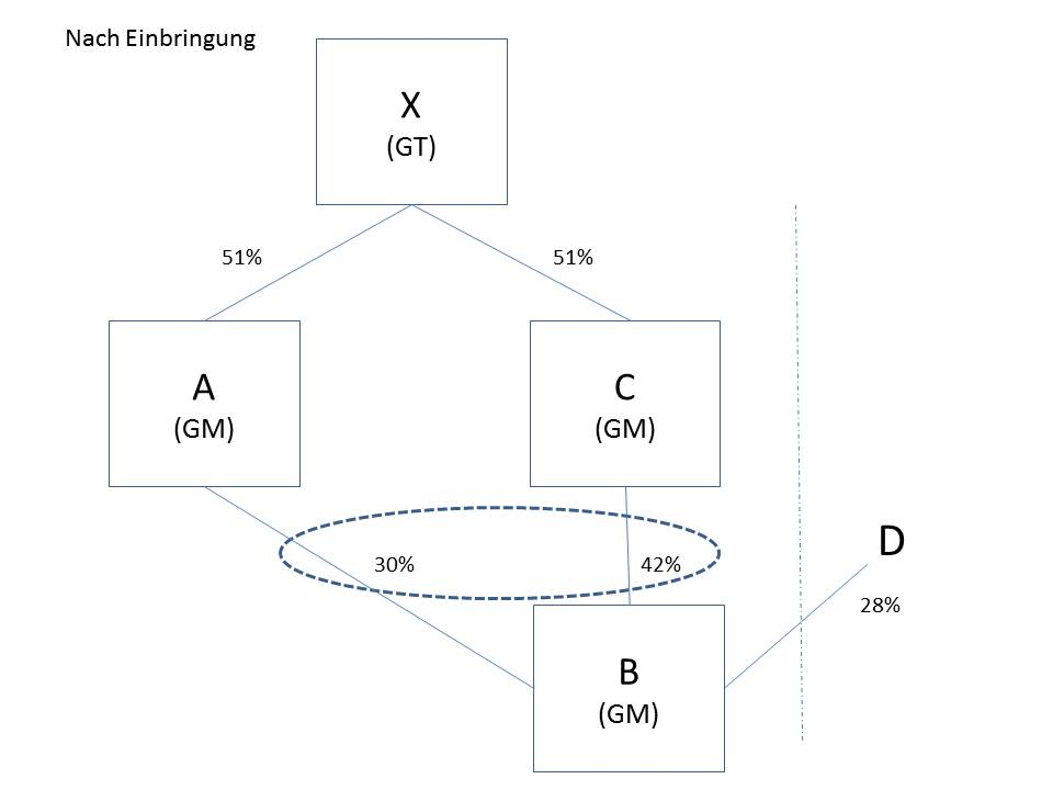 Die Einbringung erfolgt gegen Gewährung neuer Anteile gemäß § 19 Abs. 1 UmgrStG, wodurch sich die Beteiligung des Gruppenträgers X zum auf den Einbringungsstichtag folgenden Tag auf 60% vermindert und A in weiterer Folge ab diesem Stichtag zu 20% an B beteiligt ist.