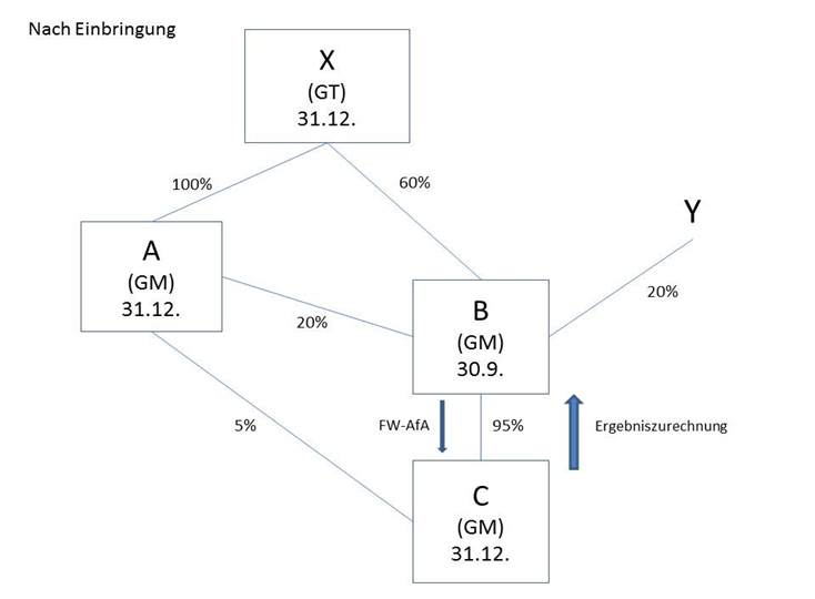 Einbringungsbedingt ist die Y-GmbH ab dem dem Einbringungsstichtag folgenden Tag (1.1.03) an der B-GmbH beteiligt.