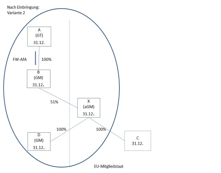 Nach den Verkehrswertverhältnissen kommt es zu einer Abstockung des Buchwertes der Beteiligung B um 35% und zu einer Zuschreibung des abgestockten Betrages auf die Beteiligung an C. Die Firmenwertabschreibung hinsichtlich der Beteiligung an B vermindert sich um den auf den eingebrachten Teilbetrieb entfallenden Teil der Bemessungsgrundlage, zB um 6.000 auf jährlich 8.000, der wegfallende auf die Beteiligung an C aktivierte Teil führt zu keiner Firmenwertabschreibung. Eine Nacherfassung der vorgenommenen Firmenwertabschreibung an der B-GmbH bezogen auf den eingebrachten Teilbetrieb erfolgt nicht.
