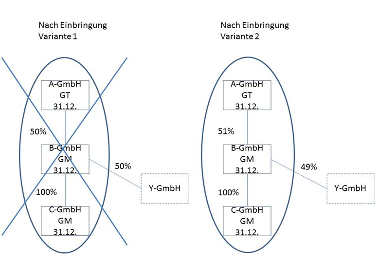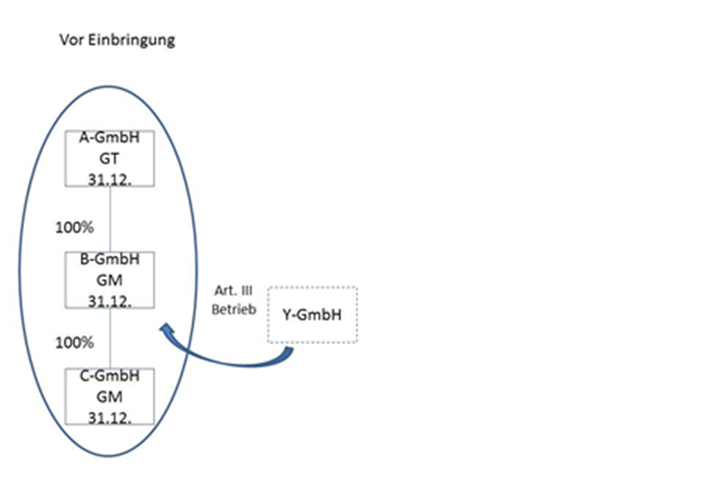 Die Unternehmensgruppe besteht aus der A-GmbH als Gruppenträger, der 100-prozentigen Tochter B-GmbH und der 100-prozentigen Tochter C-GmbH. Alle Gesellschaften bilanzieren auf den 31.12. Die unbeschränkt steuerpflichtige Y-GmbH bringt ihren Betrieb zum 31.12.02 in die B-GmbH gegen Gewährung neuer Anteile ein, sodass die Y-GmbH nach der Einbringung an der B-GmbH im Ausmaß von
