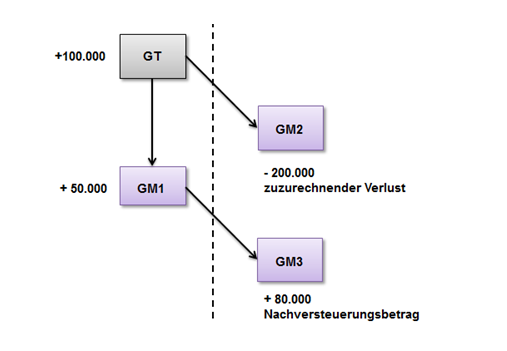 Eine Unternehmensgruppe besteht aus dem inländischen Gruppenträger GT, dem inländischen Gruppenmitglied GM1 sowie den ausländischen Gruppenmitgliedern GM2 und GM3. Sämtliche Gruppenkörperschaften bilanzieren zum 31.12. Das eigene Einkommen von GT beträgt zum 31.12.2015 100.000, das eigene Einkommen von GM1 50.000, der Verlust von GM2 beträgt nach ausländischem Recht 250.000, umgerechnet auf inländisches Recht 200.000; der zuzurechnende Verlust von GM2 beträgt somit 200.000. Beim GM3 liegt ein Nachversteuerungsbetrag in Höhe von 80.000 vor. Der Gruppenträger verfügt über vortragsfähige Verluste aus Vorjahren in Höhe von 500.000.