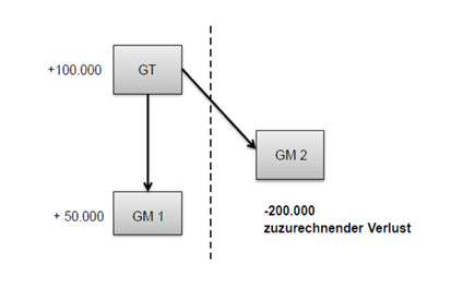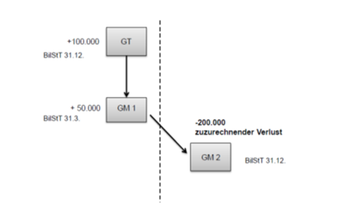 Der Gruppenträger sowie das ausländische Gruppenmitglied GM2 bilanzieren zum 31.12., das inländische Gruppenmitglied GM1 zum 31.3. Zum Bilanzstichtag 31.12.2014 beträgt der zuzurechnende Verlust von GM2 200.000.