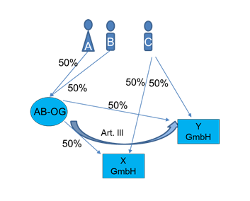 Die natürlichen Personen A und B sind zu je 50% an der betriebsführenden AB-OG beteiligt. Die OG hält einen Kapitalanteil in Höhe von 50% an der X-GmbH; ebenso hält die natürliche Person C 50% der Anteile an der X-GmbH. Die AB-OG und C bringen ihre Kapitalanteile an der X-GmbH in die Y-GmbH nach Art. III UmgrStG ein. An der übernehmenden Y-GmbH sind A und B zu je 25% und C zu 50% beteiligt.