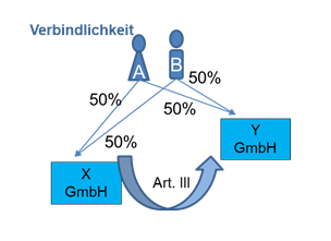 A und B sind an der X-GmbH zu je 30% beteiligt und an der übernehmenden Y-GmbH (wie im Ausgangsverhalt) zu je 50%.