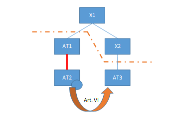 Die im Ausland ansässige Körperschaft X1 ist zu je 100% an der ebenfalls im Ausland ansässigen Körperschaft X2 sowie an der inländischen Körperschaft AT1-GmbH beteiligt. Die AT1-GmbH ist wiederum zu 100% an der inländischen Körperschaft AT2-GmbH beteiligt (Buchwert der Beteiligung: 100; Fremdvergleichswert: 500). Mit Stichtag 31.12. spaltet die AT2-GmbH einen Teilbetrieb (40% des Verkehrswerts des Vermögens von AT2) auf die von der ausländischen X2 neu gegründete, im Inland ansässige AT3-GmbH nach Art. VI UmgrStG ab. Auf die Gewährung einer Gegenleistung an die Anteilsinhaberin der spaltenden AT2-GmbH, die AT1-GmbH, wird konzernintern verzichtet.