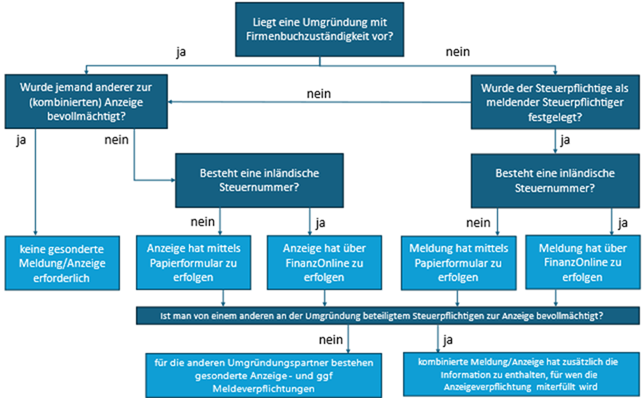 Hinsichtlich der Übermittlungsform sowie der Inhalte, die an die Anzeige geknüpft sind, ist je nach Rechtslage zu unterscheiden.Umgründungen, die nach dem 31.12.2023 beschlossen oder vertraglich unterfertigt werden (Rechtslage idF AbgÄG 2023):