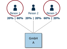 Beispiel Nominee-Vereinbarung (Treuhandschaftsverhältnis) zwischen natürlichen Personen: Die rechtlichen Eigentümer der GmbH A sind zwei natürliche Personen (Person 1 und 2) sowie eine juristische Person (GmbH B). Person 1 hält die Anteile treuhändig für Person 4, Person 2 hält die Anteile treuhändig für Person 5. Da die von Person 1 treuhändig gehaltenen Anteile zu einem wirtschaftlichen Eigentum von Person 4 führen, sind Person 1 und 4 als direkte wirtschaftliche Eigentümer an das Register zu melden. Zusätzlich muss in diesem Beispiel auch Person 3 als indirekter wirtschaftlicher Eigentümer an das Register gemeldet werden. Personen 2 und 5 sind nicht als wirtschaftliche Eigentümer zu melden, da die von Person 2 treuhändig gehaltenen Anteile kein wirtschaftliches Eigentum begründen.