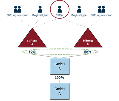 In diesem Beispiel üben sowohl die Person A als auch die Person B Kontrolle aus. Eine gemeinsame Kontrolle kann sich daher im Anwendungsbereich des § 244 Abs. 2 UGB nicht ergeben.