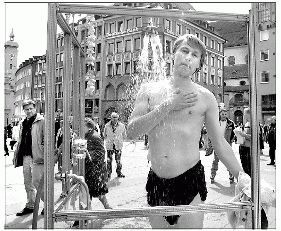 Garantiert ohne Lärmbelästigung konnte dieser Herr auf dem Münchner Marienplatz eine (solarbeheizte) Dusche nehmen – aber wer hat dazu schon die Gelegenheit? Photo: apa