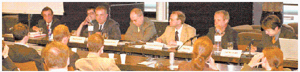 "Chaos Control": Podiumsdiskussion mit SP-Abg. Werner Kummerer, Robert Stadler (ORF On), Oberstleutnant Josef Schröfl, Prof. Christian Stadler, Moderator Benedikt Kommenda ("Die Presse"), Grün-Abg. Peter Pilz, Politologe Ralf Bendrath (von li.) [Foto: M. Seidler]