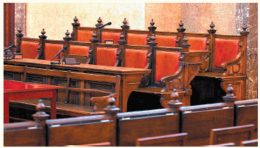 Sollen die Plätze der Geschworenen – im Bildjene im Großen Schwurgerichtssaal des Landesgerichts für Strafsachen Wien – frei bleiben? Die Strafverteidiger meinen: nein. Sie treten aber dafür ein, das Verfahren zu reformieren. [Fabry]