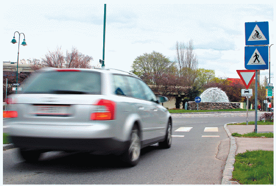 Kreisverkehr mit Fußgänger-, Radfahrerquerung: Ein Fahrer sah einen Radler nahen, ein zweiter reagierte zu spät. [Kommenda]