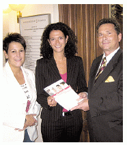 Gratulation: Claudia Danninger (Mi.) erhält ein Stipendium, SMBS-Direktor Gerhard Aumayr und Alexandra Supper, "Die Presse", gratulieren. [SMBS]