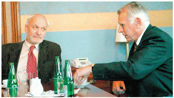 Roland Miklau (li.), als Chef der Straflegislativsektion im Justizministerium seit 1. Dezember im Ruhestand, im Gespräch mit seinem Jahrgangskollegen Johann Rzeszut, dem Präsidenten des Obersten Gerichtshofs. Er geht zu Jahresende in Pension. [Clemens Fabry]