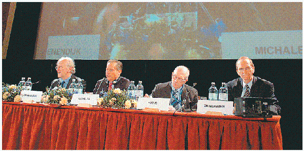 Die bisher größte Juristentagung in Österreich schloss mit dem Ausblick der Berichterstatter: Prof. Kees Groenendijk, Prof. Helmut Fuchs und Prof. Reinhard Zimmermann (von links nach rechts). Zufrieden zeigte sich Organisator und Präsident des Österreichischen Juristentags Nikolaus Michalek (2. von links). [Michaela Bruckberger]