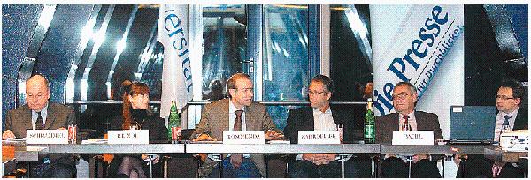 Sport trifft Medizin trifft Recht: Gerhard Zadrobilek (3. v. re.), 1981 Sieger der Österreich-Rundfahrt, diskutiert mit Mediziner Prof. Norbert Bachl (2. v. re.), Doping-Analytiker Günter Gmeiner (re.), Strafrechtlerin Prof. Susanne Reindl, Arbeits-, Sozialrechtler Prof. Walter Schrammel (li.). Moderator: Benedikt Kommenda ("Die Presse"). [Michaela Bruckberger]