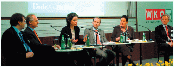 Das Podium: Franz Marhold (Uni Graz, l.) bot das juristische Fundament, Martin Gleitsmann (WKÖ, 2. v. l.) und Dwora Stein (Privatangestellten-Gewerkschaft, 3. v. l.) vertraten die Sozialpartner, Eva-Elisabeth Szymanski (2. v. r.) das Wirtschaftsministerium, Stefan Vlasich (r.) die Sozialversicherung der gewerblichen Wirtschaft; Moderation: Benedikt Kommenda ("Die Presse"). [Michaela Bruckberger]
