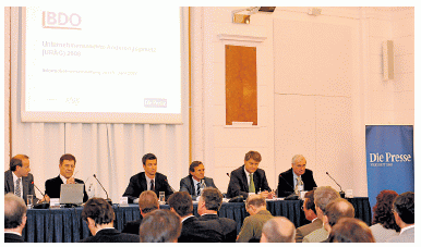 Expertenrunde im Rittersaal der Kontrollbank (von rechts): Anwalt Eduard Saxinger, Peter Bartos (BDO), Christian Nowotny (WU), Martin Weber (Justizministerium), Karl Bruckner (BDO), Moderator Benedikt Kommenda ("Presse"). [Michaela Bruckberger]